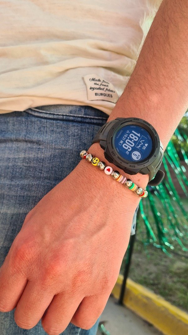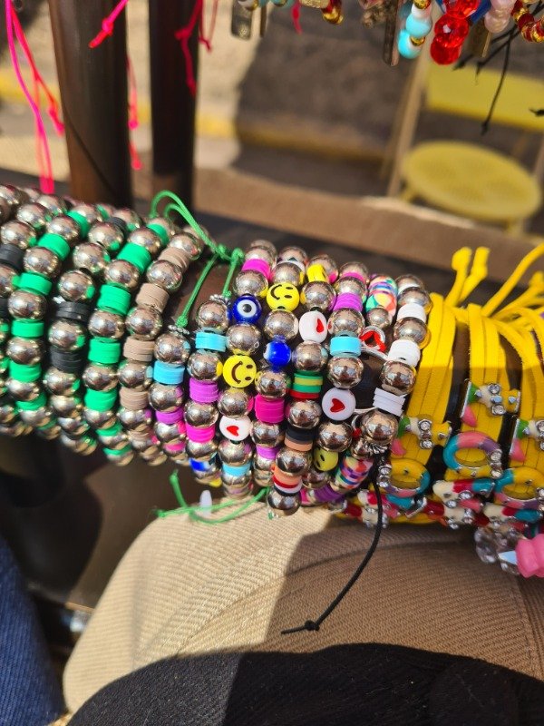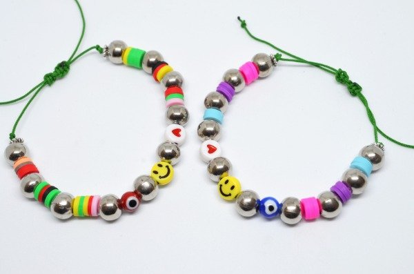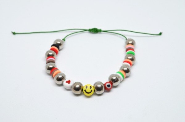 pulsera rgulable, fimo, dijes y pelotitas de metal