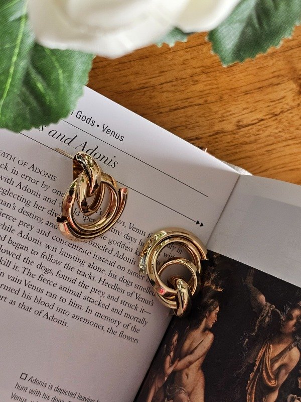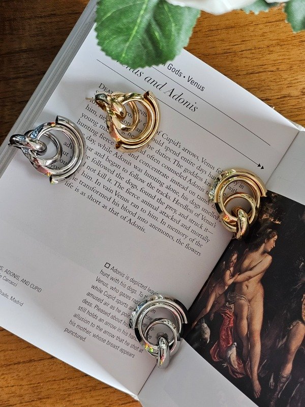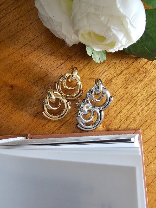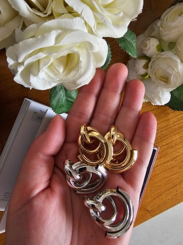 Par de aros de aluminio bañado en oro y plata, de peso liviano y tamaño medio. Los aros protagonistas de tu look son todo lo que necesitas para resaltar tus basicos. Se recomienda no mojarlos con agua ni alcohol para conservar su brillo más tiempo.